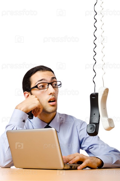 Бизнесмен с ноутбуком и телефонными трубками