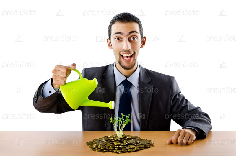 Бизнесмен с золотыми монетами и саженцами