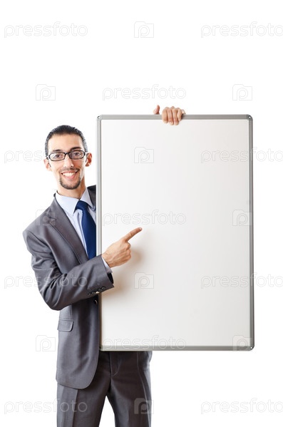 Молодой бизнесмен с белой доской в руках