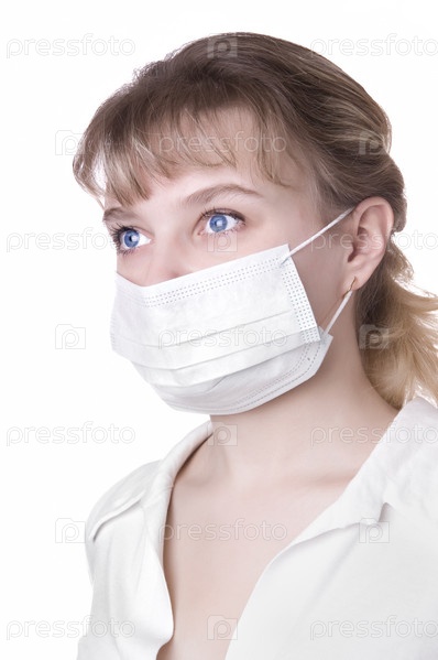 Молодая медсестра в маске с голубыми глазами на белом фоне