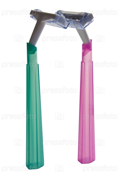 Два прозрачных пластиковых бритвы с колпачками на лезвиях изолированы на белом фоне