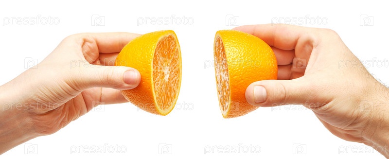 Две половинки апельсина в женской и мужской руках