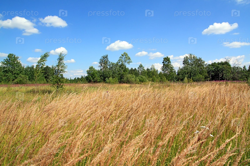 Поле с пожелтевшей травой и деревья на горизонте, летний пейзаж