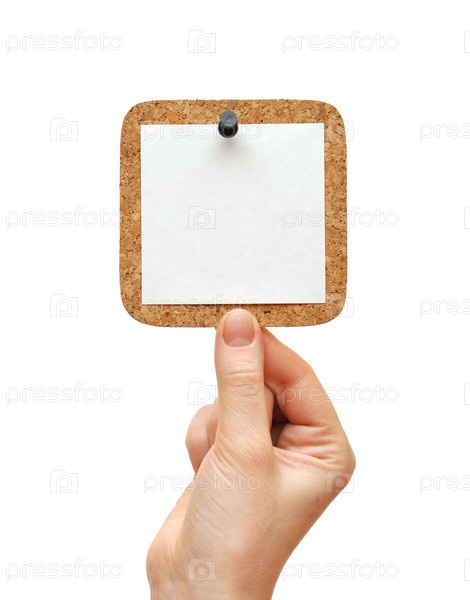 Пробковая панель с листом бумаги в руке, на белом фоне