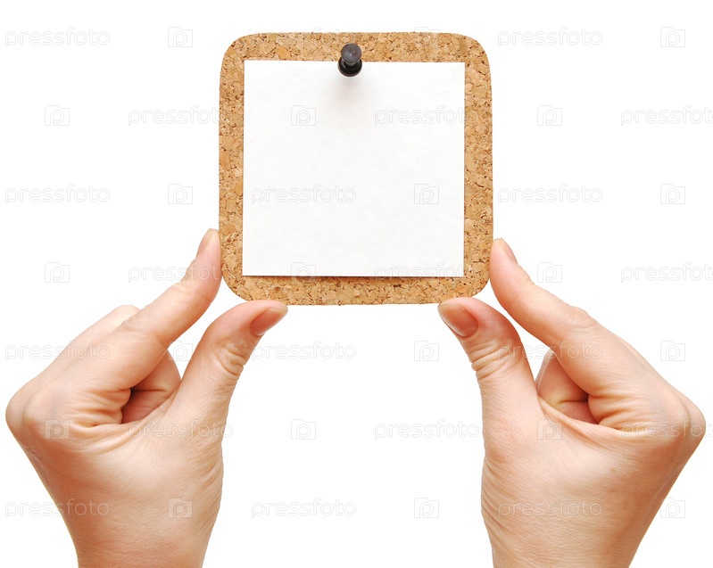 Пробковая панель с листом бумаги в руках, на белом фоне