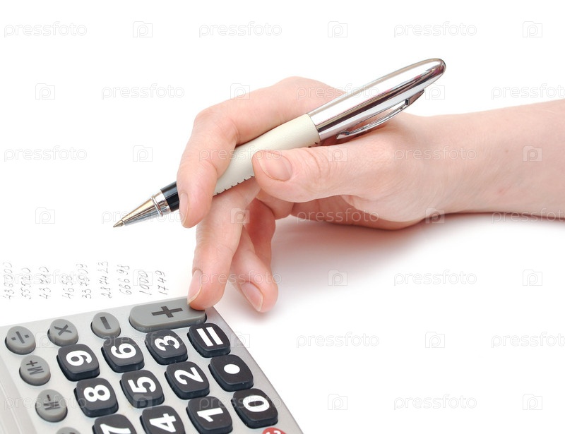 Женщина считает на калькуляторе, на белом фоне, крупный план