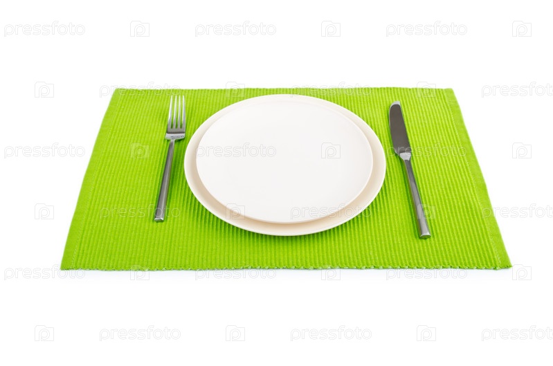 Тарелка, нож и вилка на салфетке на белом фоне