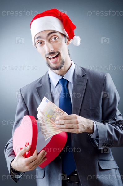 Бизнесмен в шапке Санты с банкнотами евро в руке