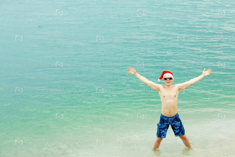 Парень в шапочке Санты на берегу моря