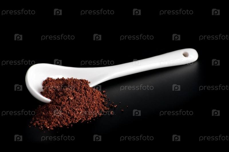 Белая ложка с кофейным порошком на черном фоне