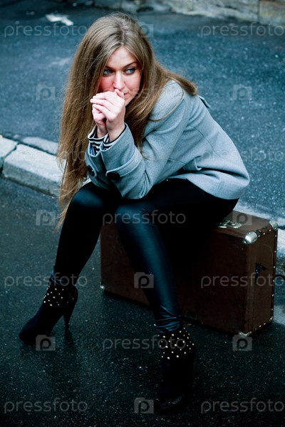 Девушка сидит на чемодане