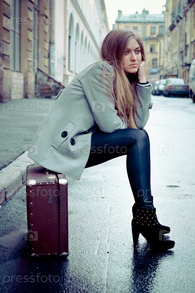 Девушка сидит на чемодане