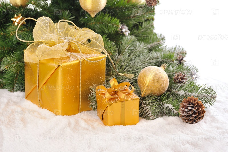 Золотые рождественские подарочные коробки под украшенной елью на снегу