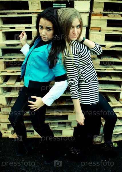 Портрет двух девушек на фоне ящиков