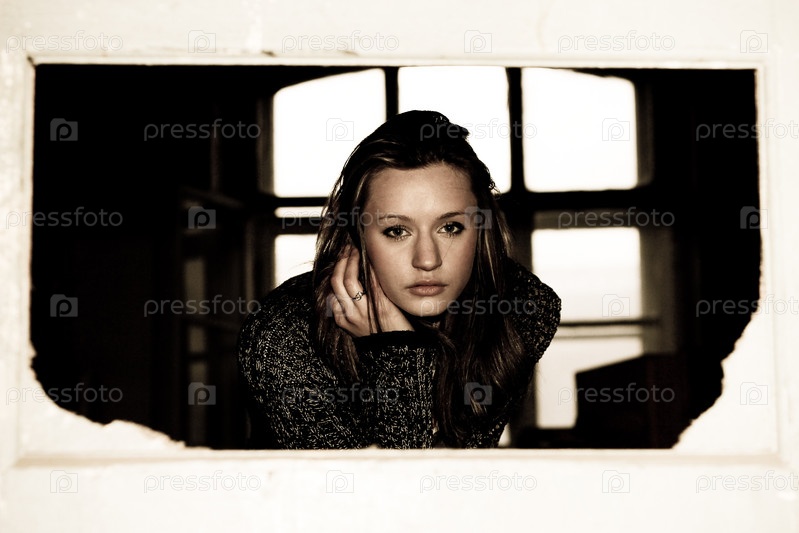Портрет брюнетки на фоне окна, сепия