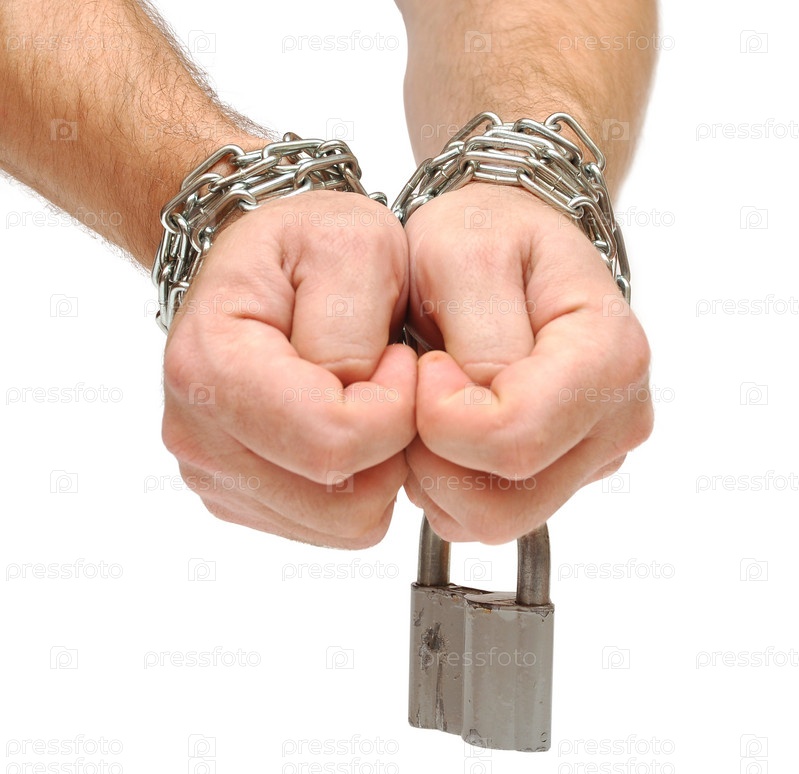 Руки, связанные цепью с замком, изолированы на белом фоне