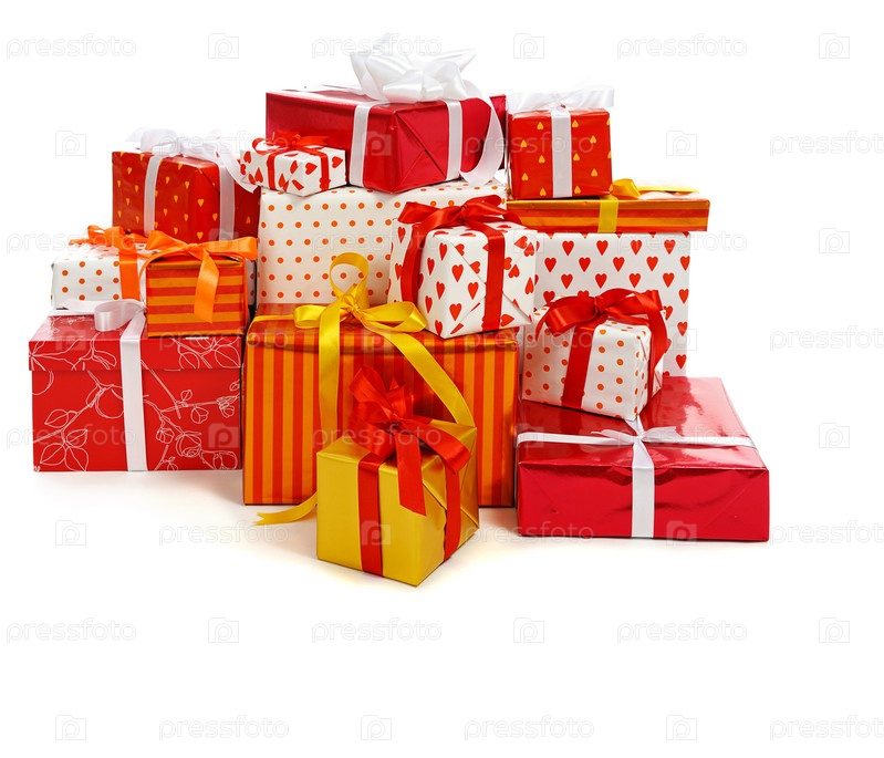 Стопка праздничных коробок с атласными лентами, на белом фоне