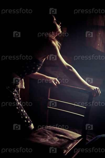 Девушка в сарафане опирается на стул