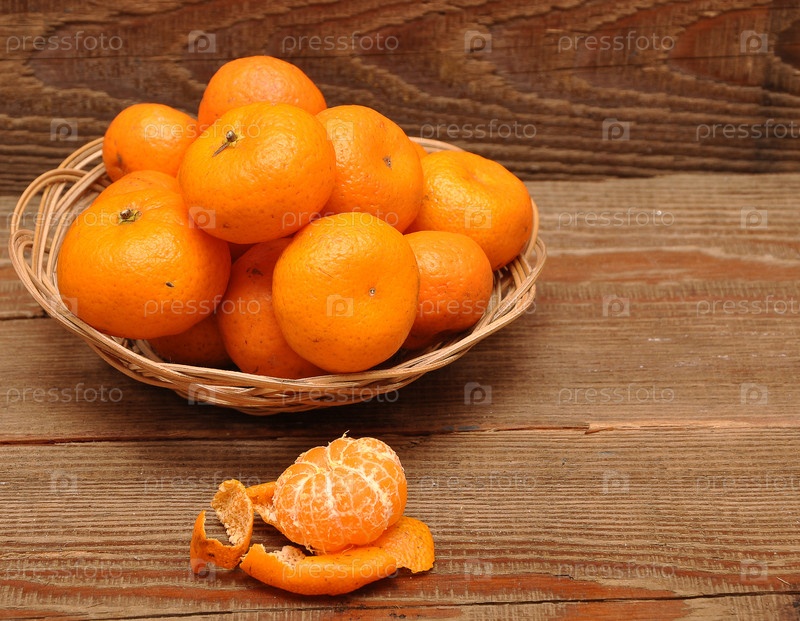 Спелые мандарины в корзине на деревянном столе