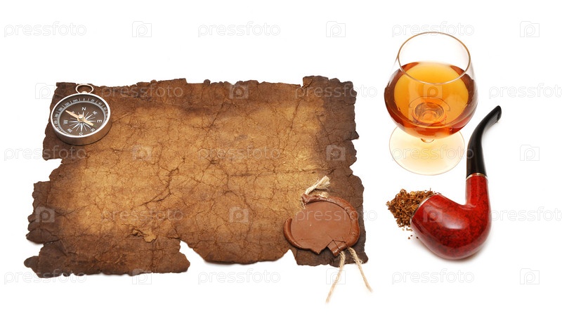 Курительная трубка, компас, бокал коньяка и старая бумага с сургучной печатью