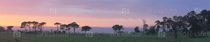 Панорама восход солнца в Вестернпорте с видом на Остров Филип, коровы и большие эвкалипты Виктория, Австралия