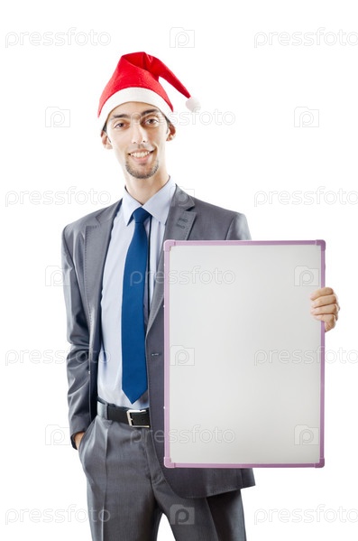 Бизнесмен в колпаке Деда Мороза с пустым плакатом на белом фоне