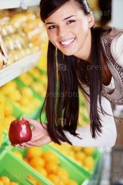 Девушка в супермаркете выбирает фрукты