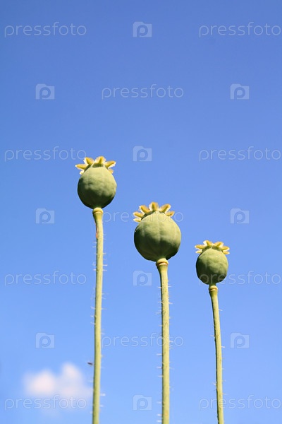 Плоды мака на фоне голубого неба
