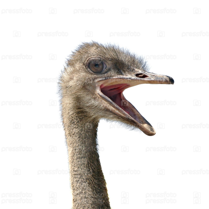 Голова страуса с раскрытым клювом на белом фоне