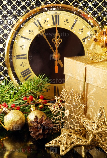 Рождественский подарок, елочные украшения и часы