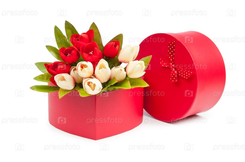 Подарочные коробки и тюльпаны на белом