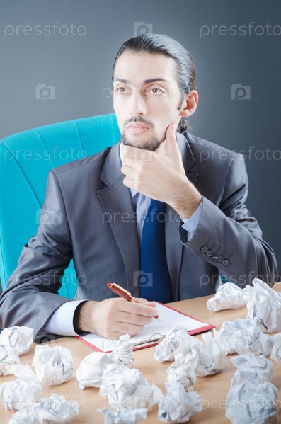 Задумчивый бизнесмен сидит за столом и держит ручку