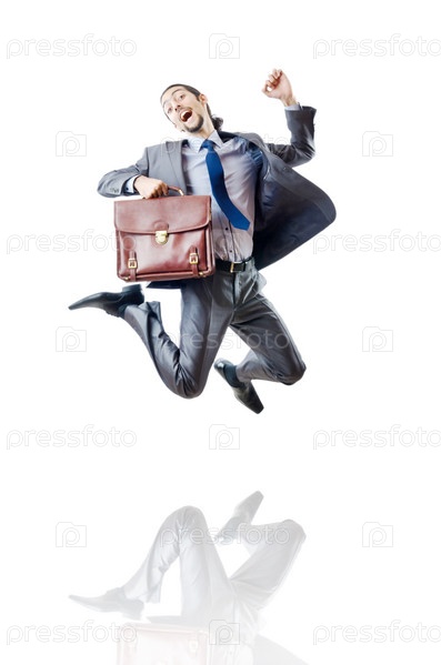 Бизнесмен с портфелем в прыжке на белом фоне