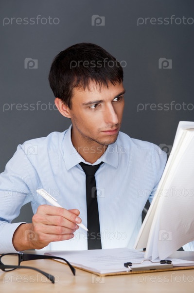 Деловой молодой человек, подписывающий документы за столом