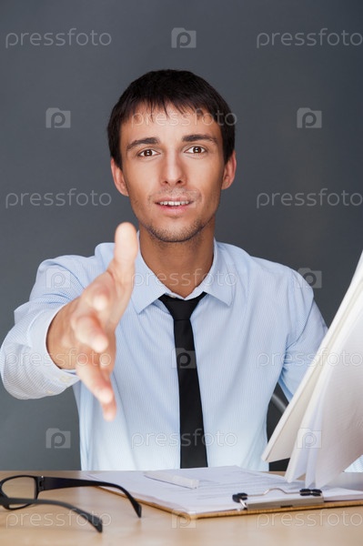 Деловой молодой человек проводит переговоры, протягивая руку