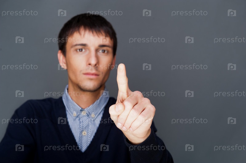 Деловой молодой человек нажимает пальцем на сенсорный экран