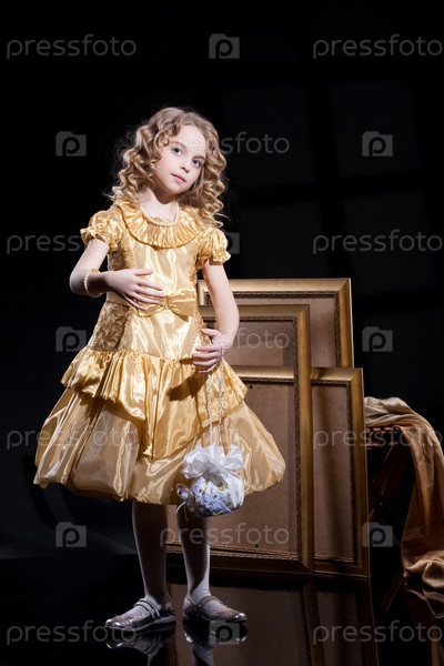 Красивая блондинка в золотом платье на фоне студии