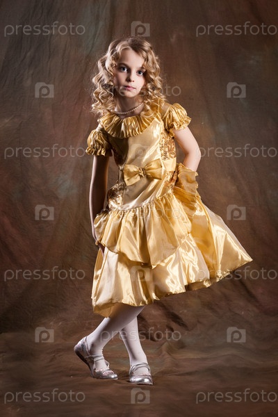 Красивая блондинка в золотом платье на фоне студии