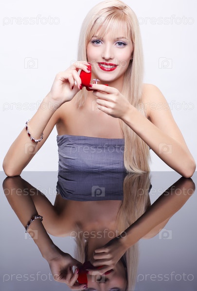 Девушка с длинными светлыми волосами с кольцом в руке