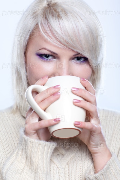 Портрет девушки в теплом свитере с чашкой горячего чая