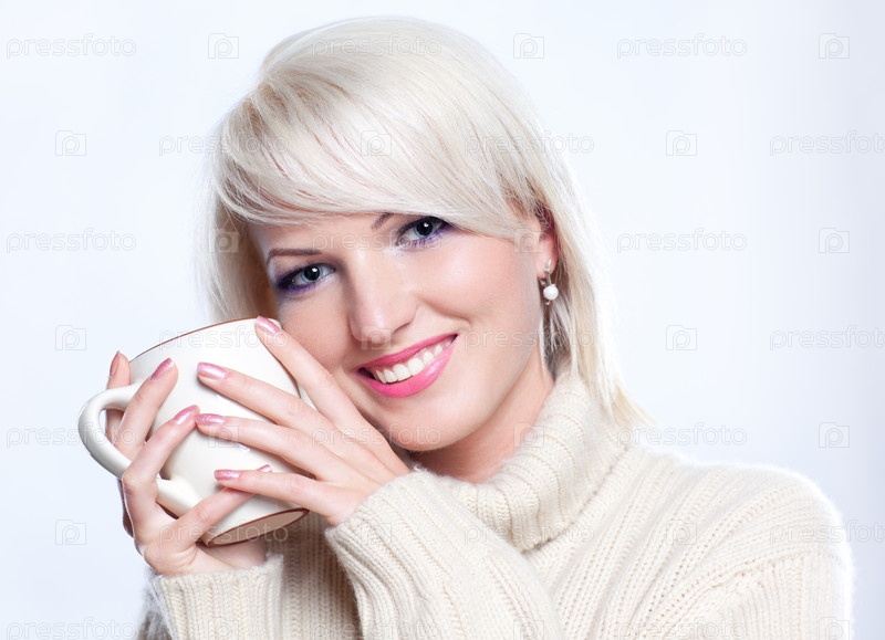 Портрет девушки в теплом свитере с чашкой горячего кофе