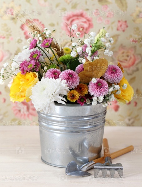 Букет цветов в железном горшок и садовый инвентарь
