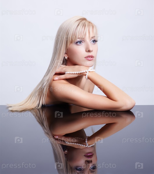 Портрет молодой гламурной блондинки с ниткой жемчуга