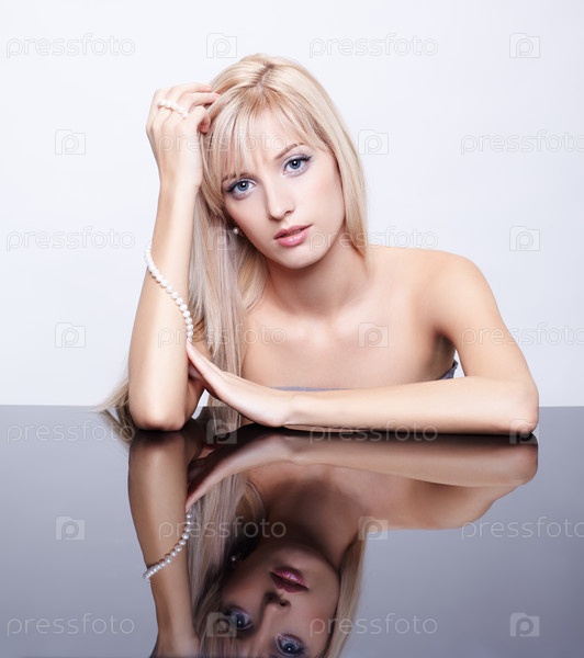 Портрет молодой гламурной блондинки с ниткой жемчуга