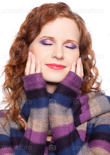 Портрет девушки в шерстяной кофте и шарфе с закрытыми глазами