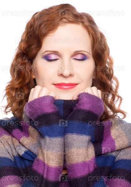 Портрет девушки в шерстяной кофте и шарфе с закрытыми глазами