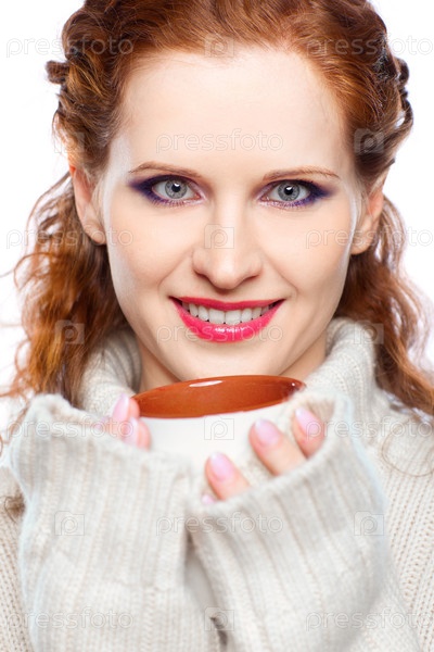 Девушка в кашемировом свитере с чашкой горячего чая