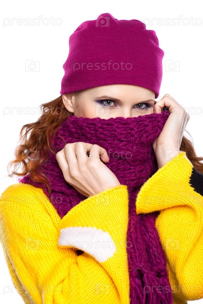Молодая женщина в шапке и шарфе, изолирована на белом фоне