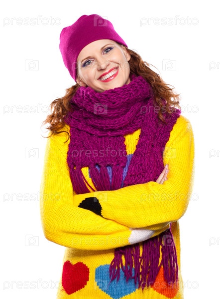 Молодая женщина в шапке и шарфе, изолирована на белом фоне
