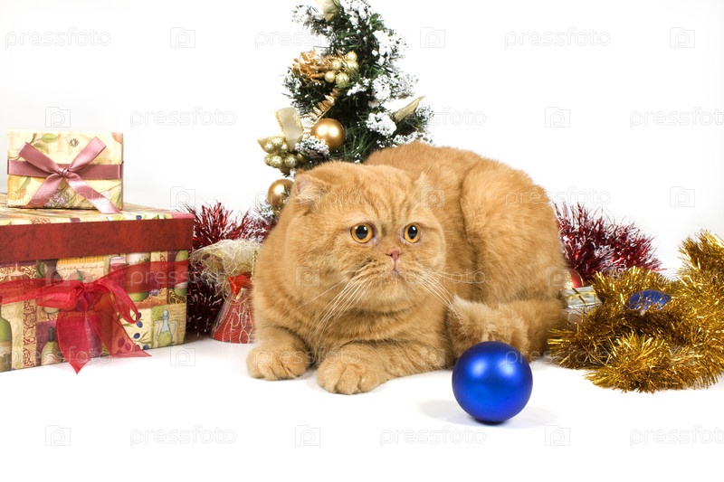 Рыжий кот на фоне новогодней елки и подарков
